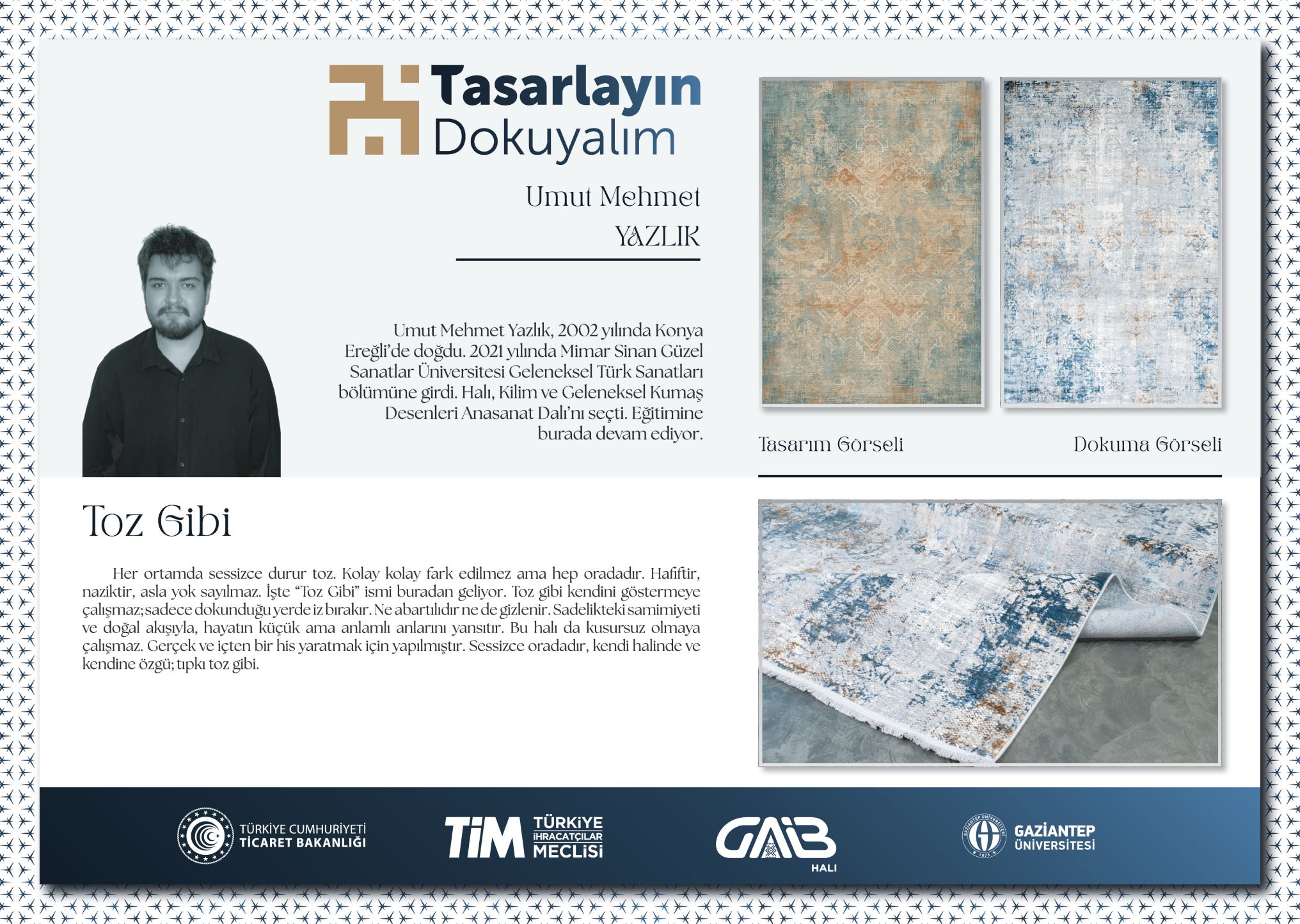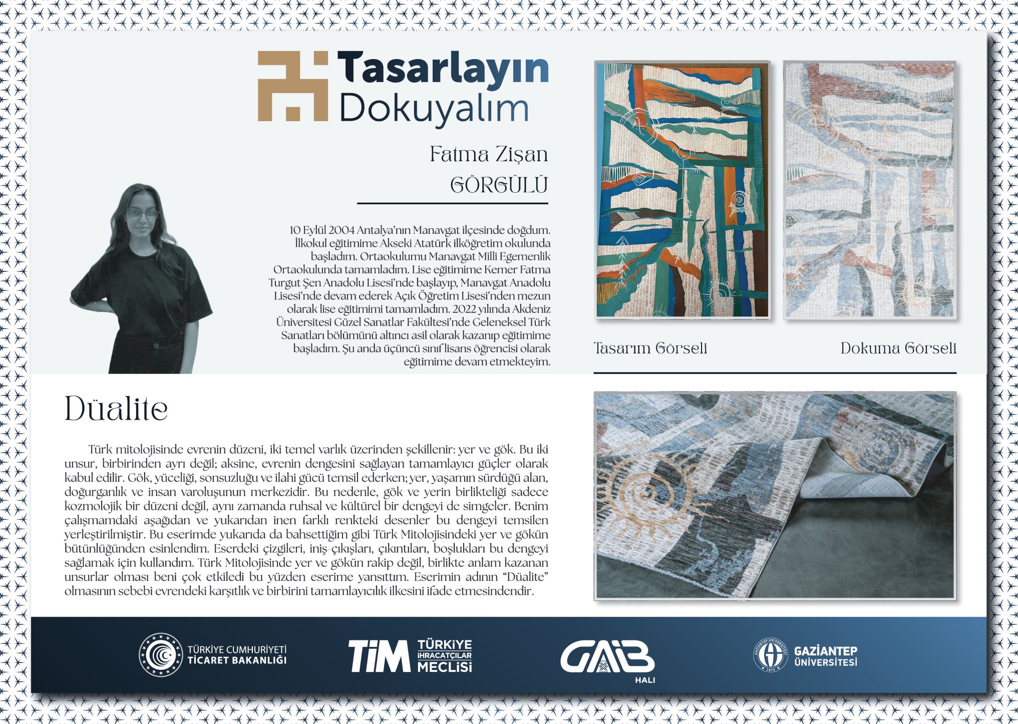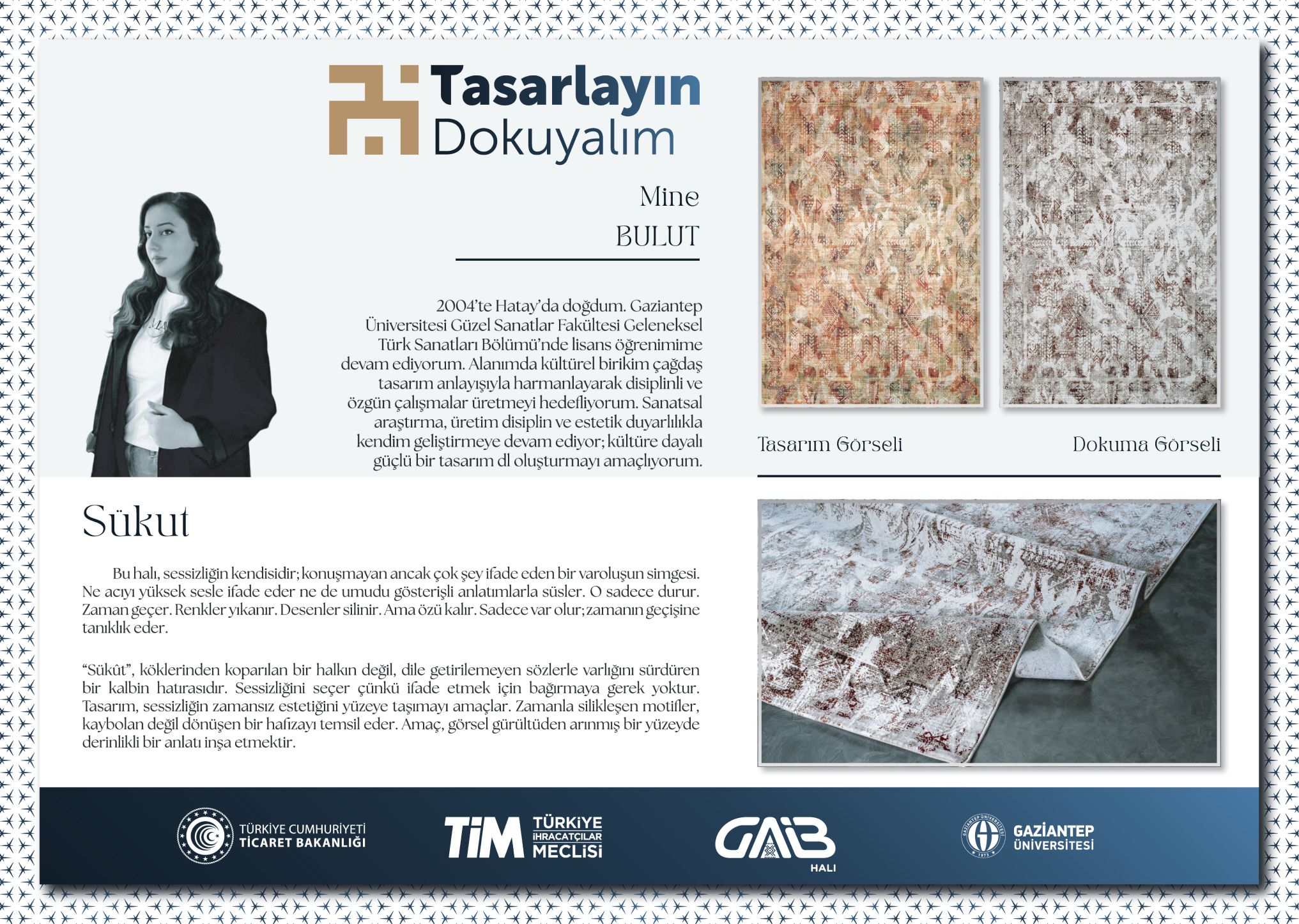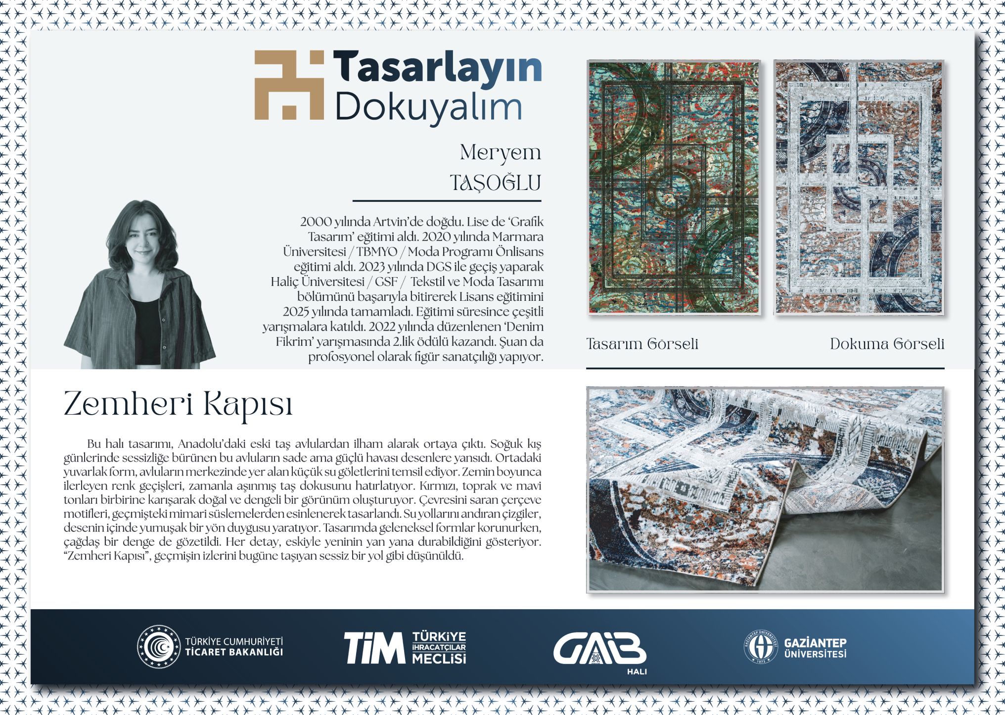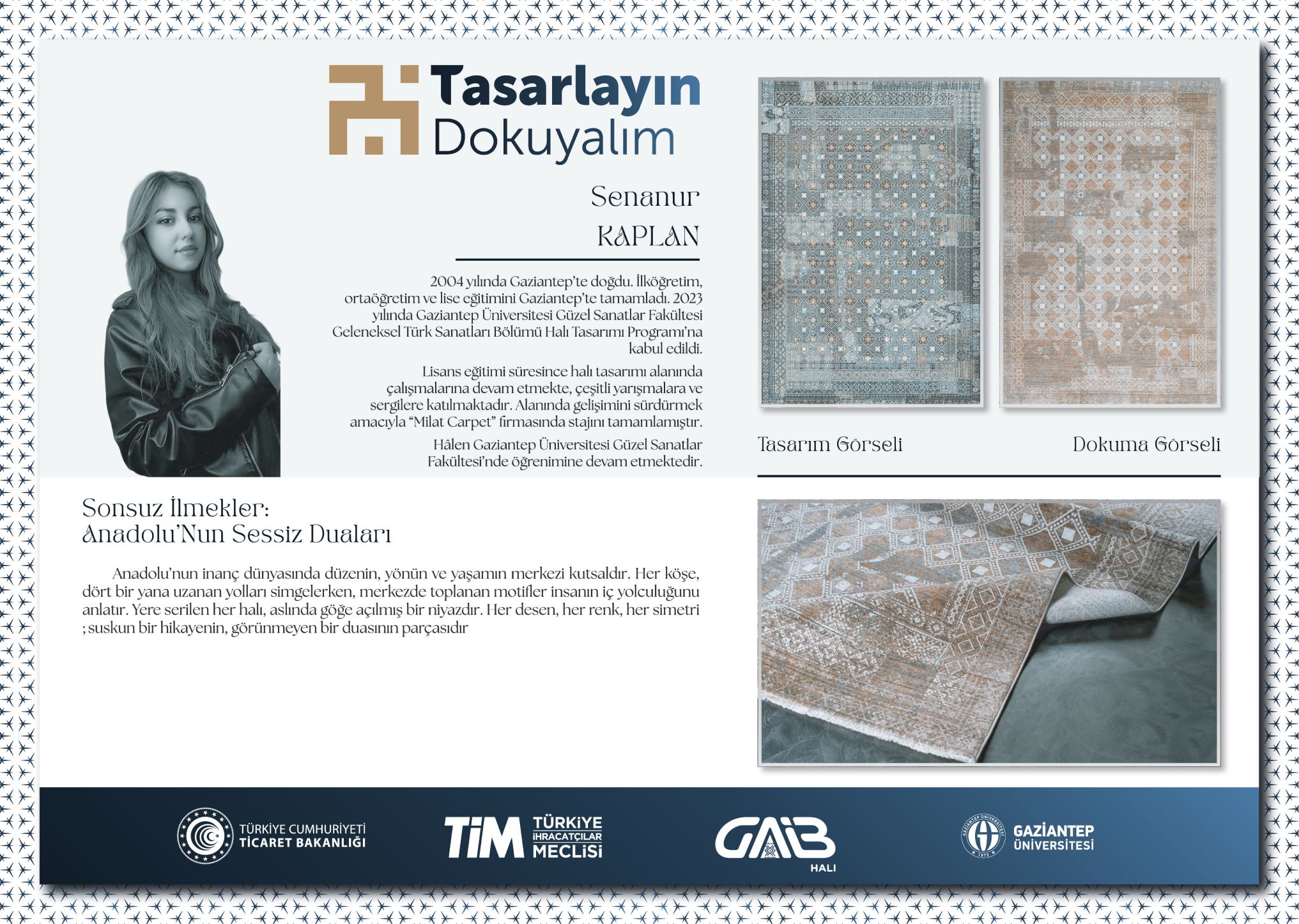 1) Senanur KAPLAN, “Sonsuz İlmekler: Anadolu’nun Sessiz Duaları” tasarımıyla yarışmada birinci olarak 125.000 TL değerindeki birincilik ödülünü almıştır.