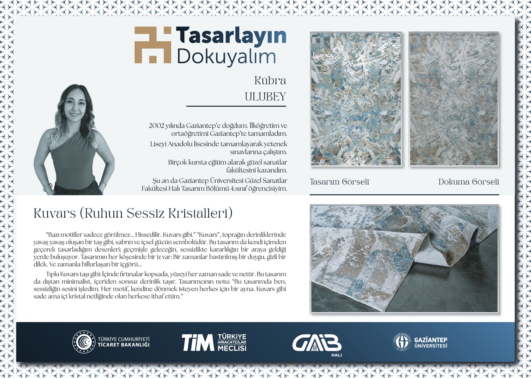 2) Kübra ULUBEY, “Kuvars (Ruhun Sessiz Kristalleri).” tasarımıyla yarışmada ikinci olarak 100.000 TL değerindeki ikincilik ödülünü almıştır.